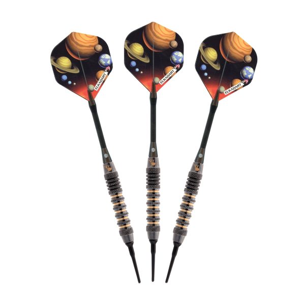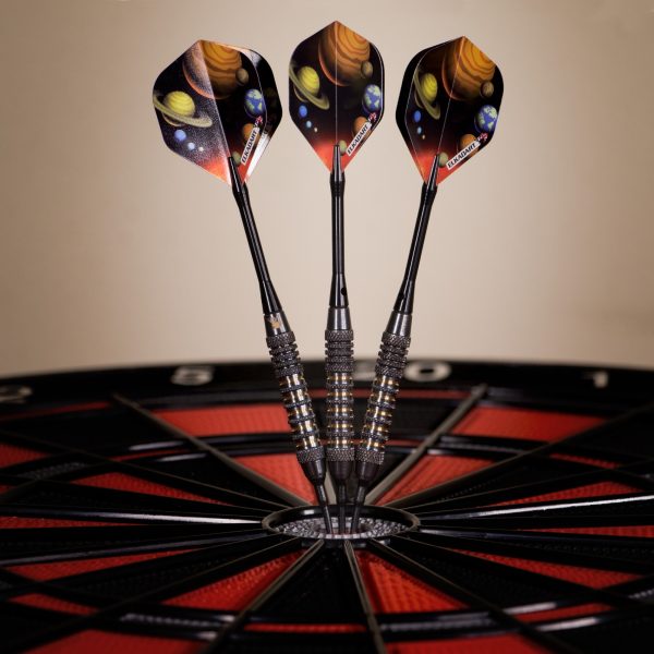 Boldly take your game where no one has gone before when you bring the Elkadart Orbital Soft Tip Darts, designed for use with either electronic dart boards or most sisal dart boards. These darts are packed with features starting with the barrel, fashioned from chromed bronze alloy. Constructing the darts in this fashion allows us to bring you tough, weighted barrels without breaking the bank. Used in construction for its high end appearance and durability at a lower cost, we use this alloy to provide the highest quality barrels at the best cost to you. Each barrel possesses recessed rings allowing your grip to remain precise throw after throw. The Orbital Darts feature tough, lightweight aluminum shafts. These shafts feature locking holes that allow a more secure fit to your barrel; you won’t find yourself retightening these shafts after a shot or two. Finally, each dart is finished off with stellar solar system designs adorning each flight, for an lightspeed look on each dart. Each set includes three flights, three shafts, three 2BA Tufflex II Tips and a slim dart case.