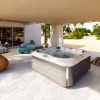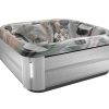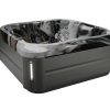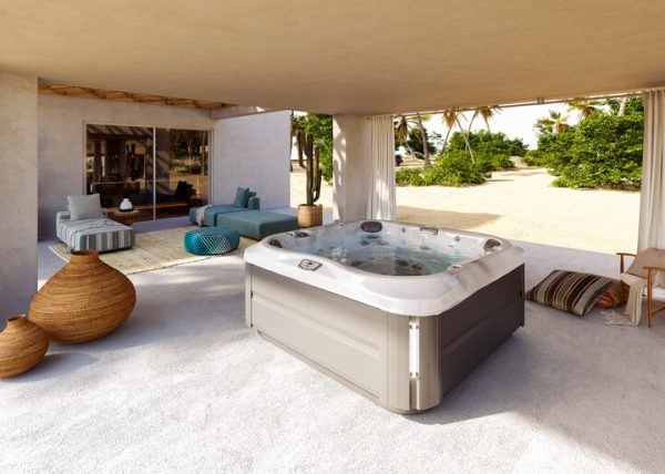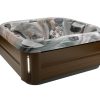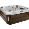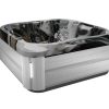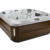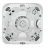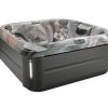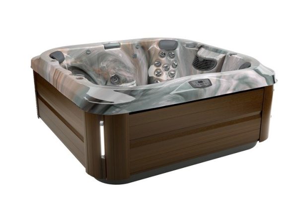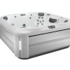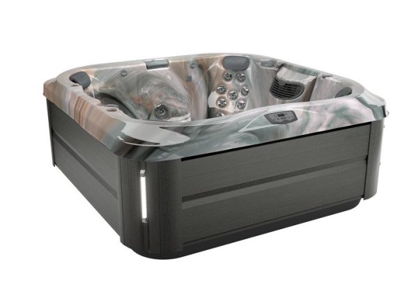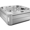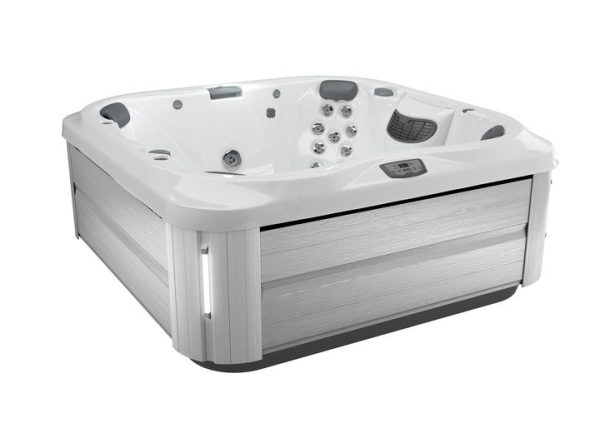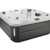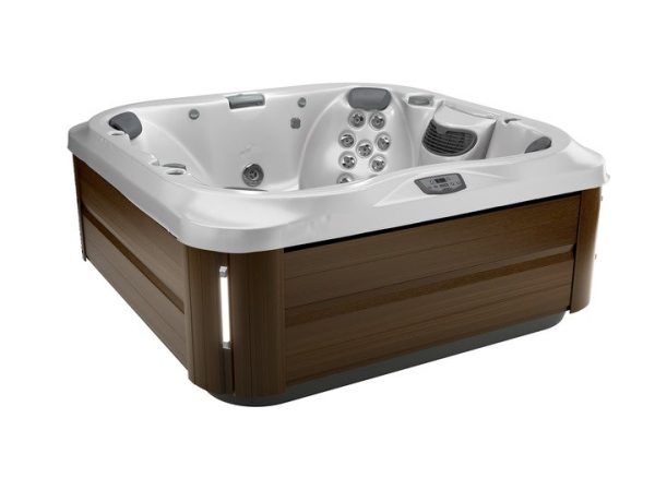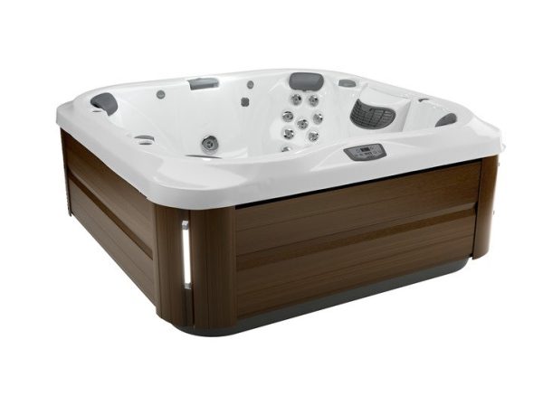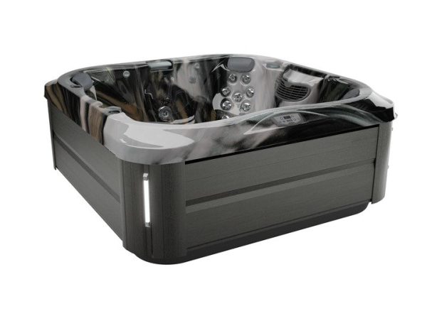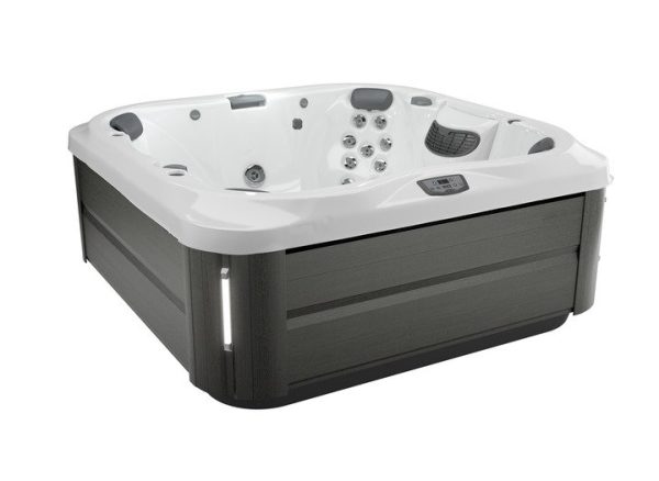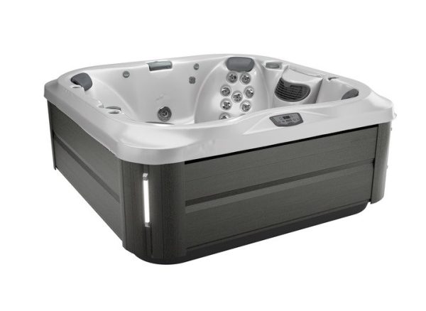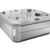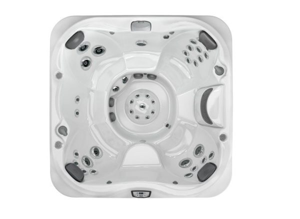 The square J-345™ Hot Tub is moderate in size Features Jacuzzi® PowerPro™ jets Delivers relaxing massage in the Jacuzzi® PowerPro™ Therapy Seat Distinguish by sophisticated ProFinish™ cabinetry with optional corner accent lighting Easy-to-use control panel HydroSoothe™ no-splash jetted massage pillow