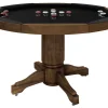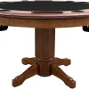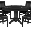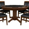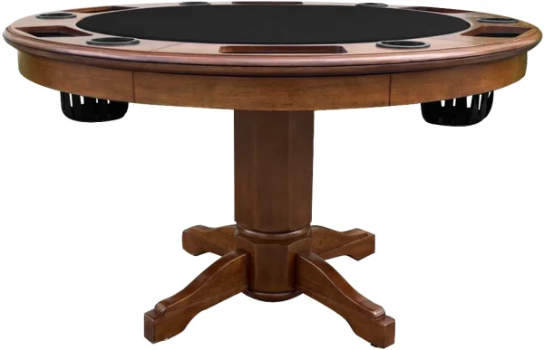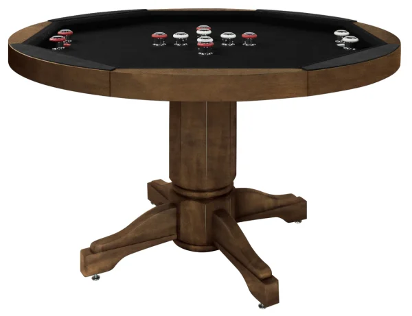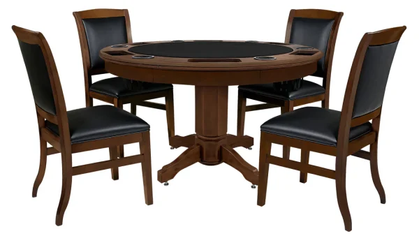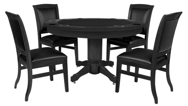 Invite friends and family over for game night with this 54″ Heritage 3 in 1 game set. This combo converts easily from a dining table, to an six player poker table with the flip of the top. Remove the top to reveal the Bumper Pool option. The Heritage Game Set includes four matching chairs with cushioned black vinyl seats, the modern crafted table set ensures everyone stays comfortable. Finishes available are Raven or Nutmeg