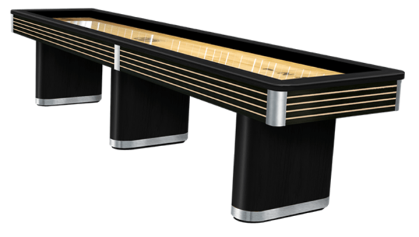 The Heritage Shuffleboard Table is made from Solid Wood and features modern, flat paneled cabinet with natural maple accents and pedestal base legs with Brushed Aluminum Trim on legs and apron. All Olhausen Shuffleboards are hand-crafted at our 250,000 sq. ft. manufacturing facility in Portland, TN.