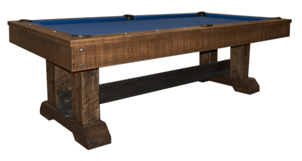 The Railyard Pool table is made from reclaimed train rail and re-purposed hardwood timbers from century old railroads and special round date nail sites.