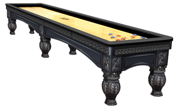 The Venetian Shuffleboard Table is made Solid Wood and features ornate carving details on cabinet and legs. All Olhausen Shuffleboards are hand-crafted at our 250,000 sq. ft. manufacturing facility in Portland, TN.