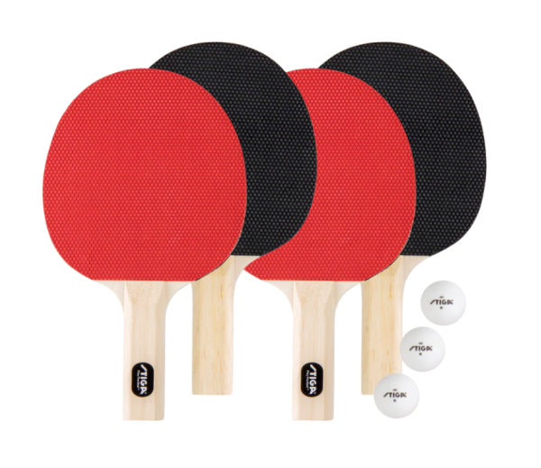 USATT approved table tennis set that includes four hardbat rackets and 3 white 1-star ITTF regulation size balls (40mm) made from tough materials that will keep your family playing for years. This set was created for beginners looking to build their table tennis skills. This sturdy table tennis racket has a straight handle and 5-ply blade with short pips rubber.