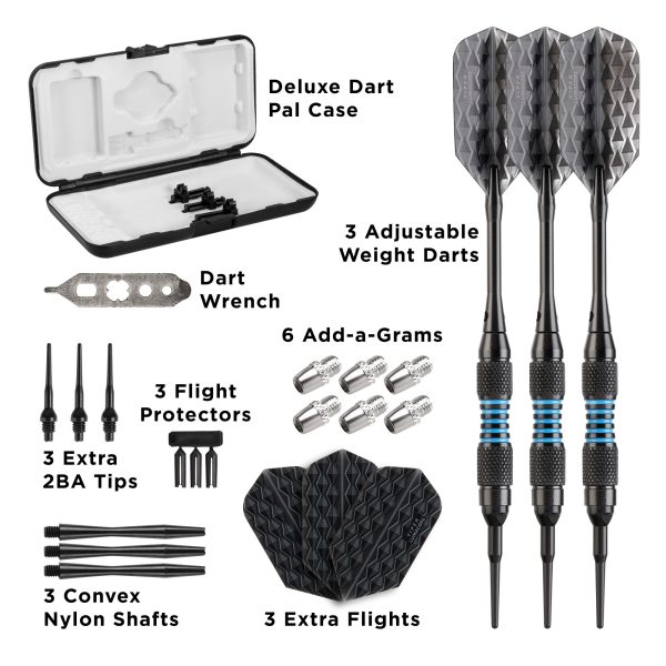 • Included – Dart wrench, 6 add-a-grams, three extra 2BA tips, three flight protectors, three nylon shafts, three extra flights, and a deluxe dart pal case