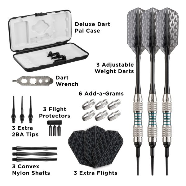 - Included – Dart wrench, 6 add-a-grams, three extra 2BA tips, three flight protectors, three nylon shafts, three extra flights, and a deluxe dart pal case