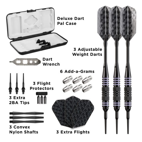 - Included – Dart wrench, 6 add-a-grams, three extra 2BA tips, three flight protectors, three nylon shafts, three extra flights, and a deluxe dart pal case
